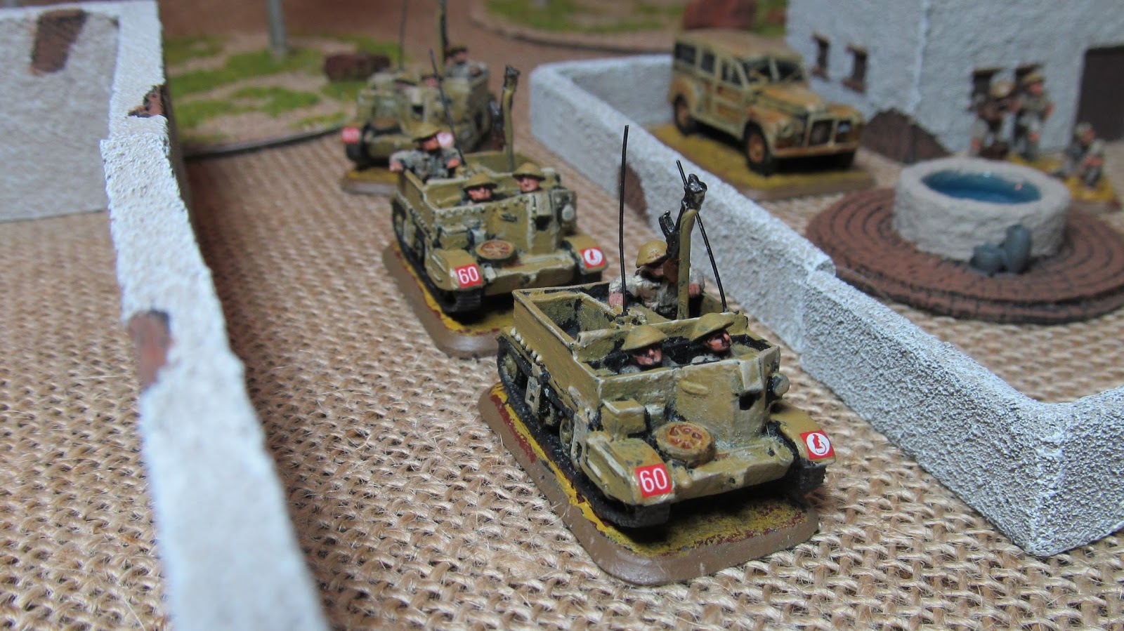 Bren carriers navigating between the walls of the village.